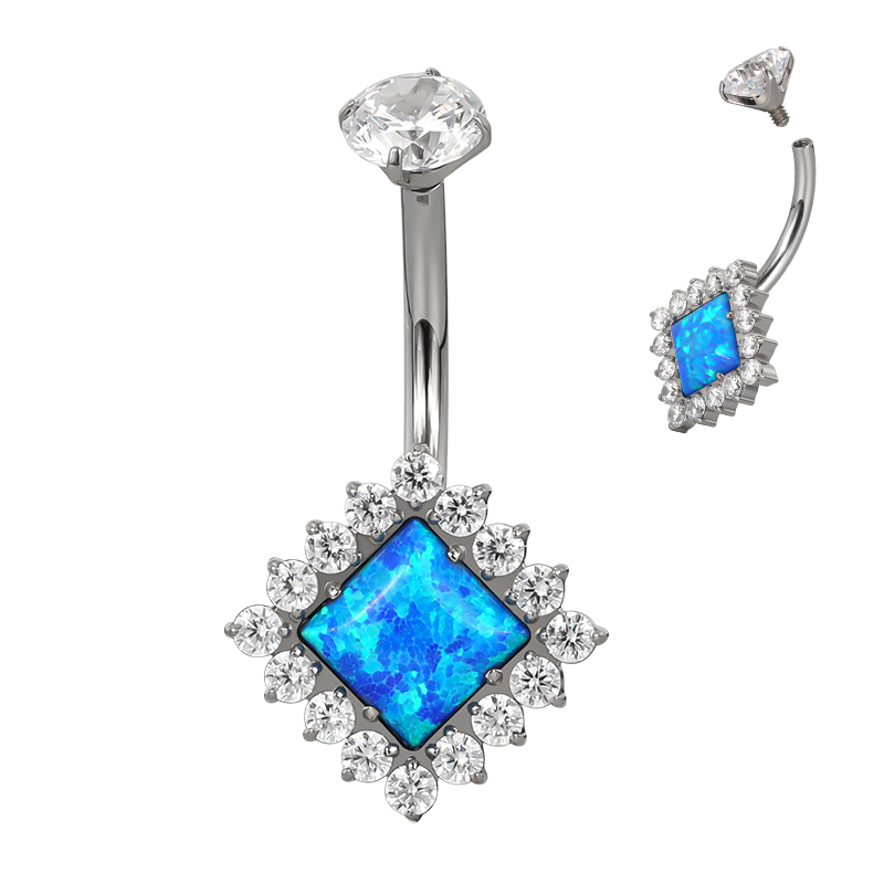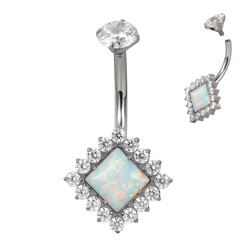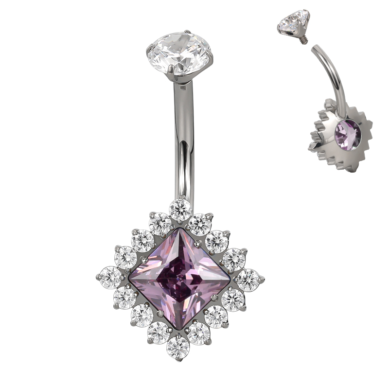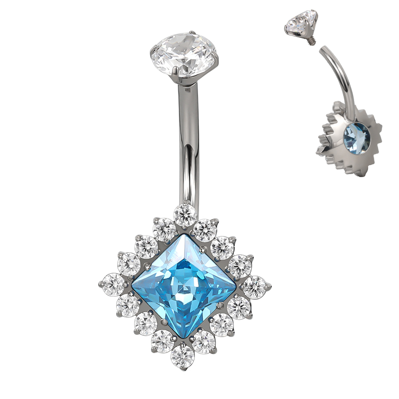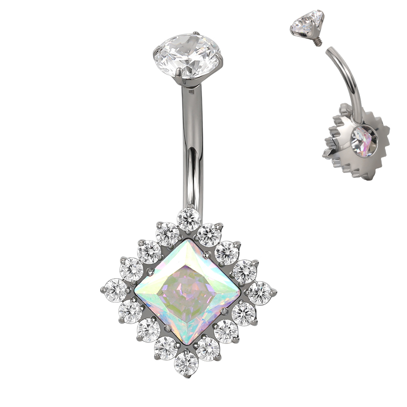 Titanium Internally Threaded Bezel Set CZ Top With Square CZ Center Flower Belly Ring