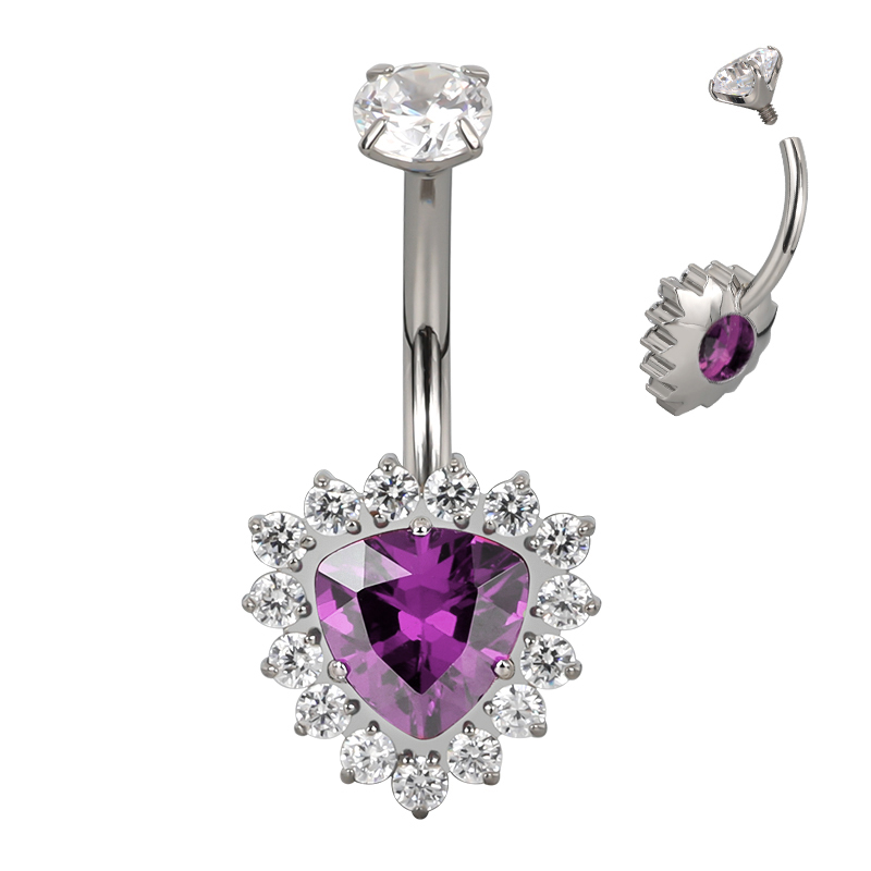 Titanium Internally Threaded Bezel Set CZ Top With Triangle CZ Center Flower Belly Ring