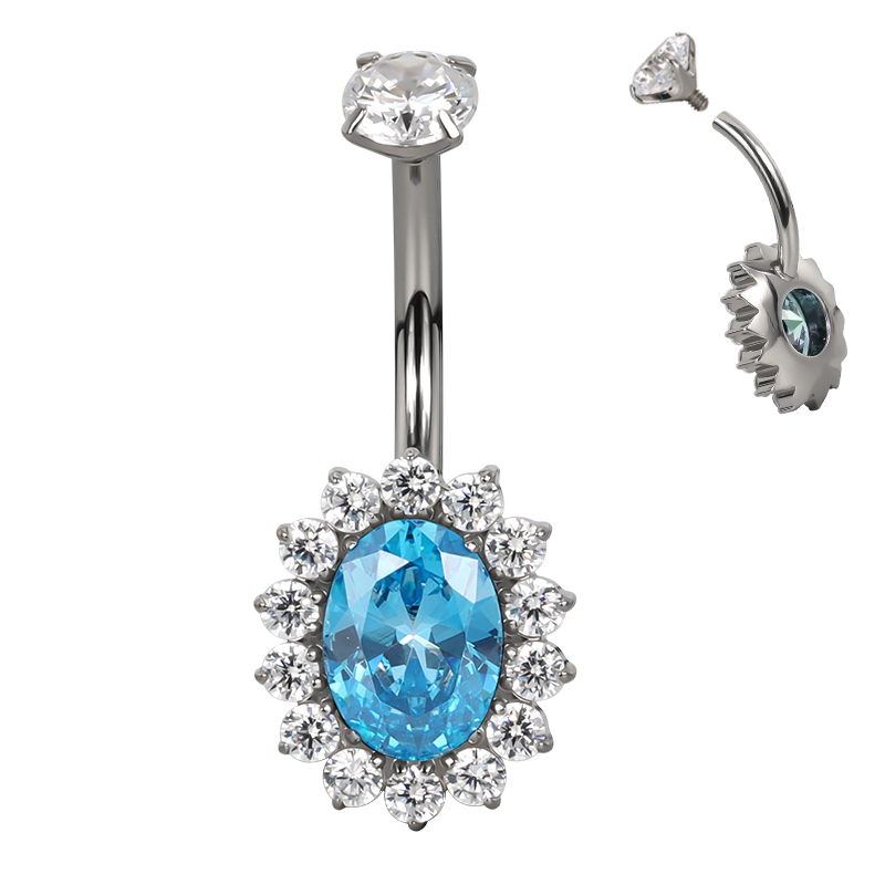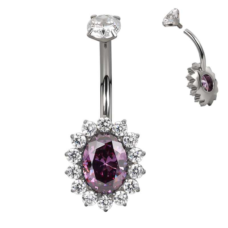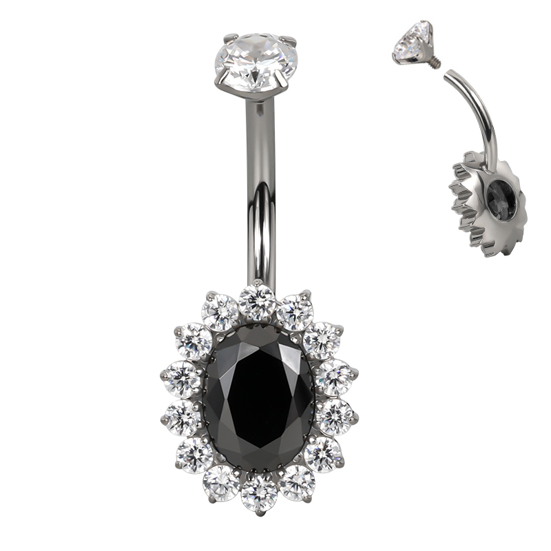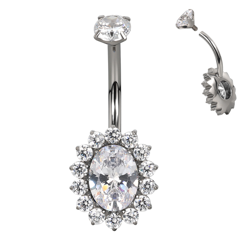Titanium Internally Threaded Bezel Set CZ Top With Oval CZ Center Flower Belly Ring
