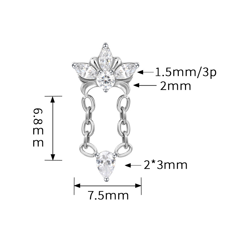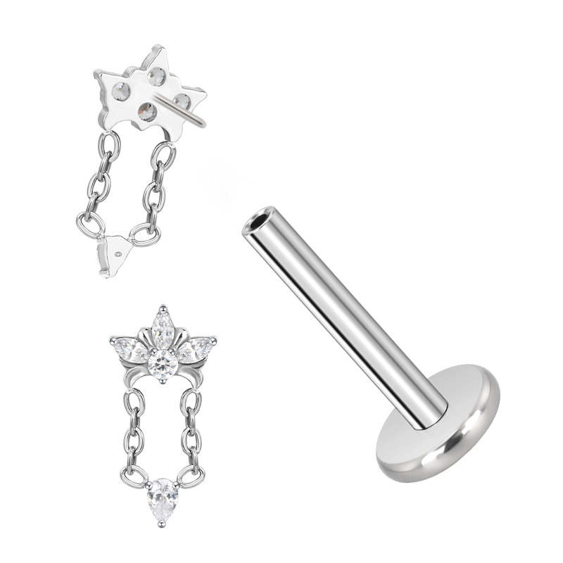 Titanium Push In CZ Lotus With Pear CZ Dagnle Center Threadless Top