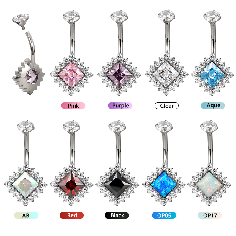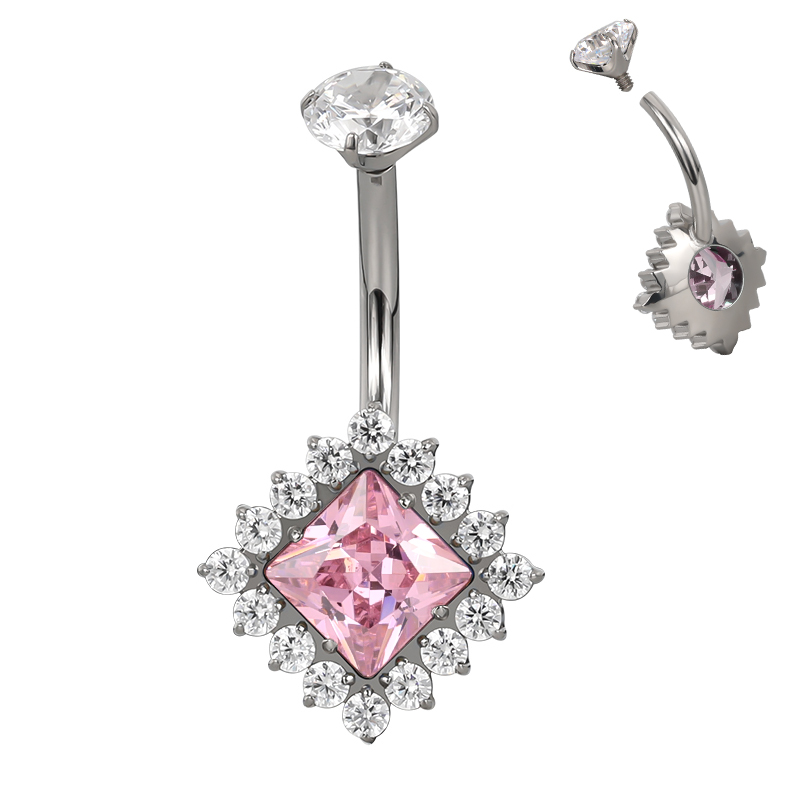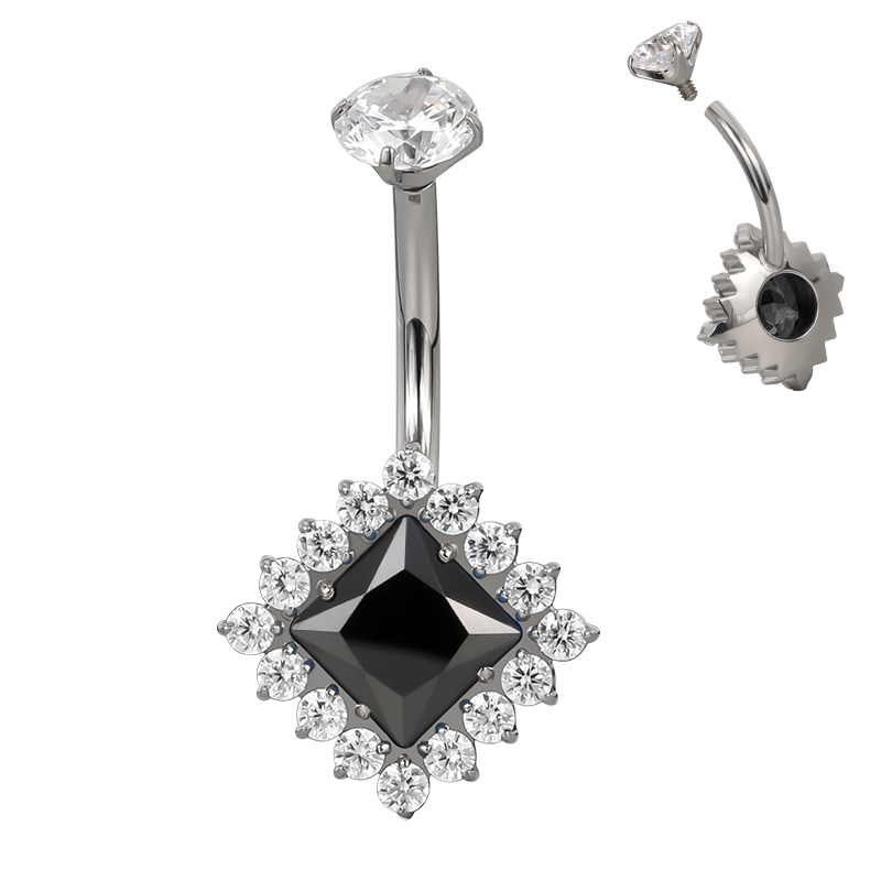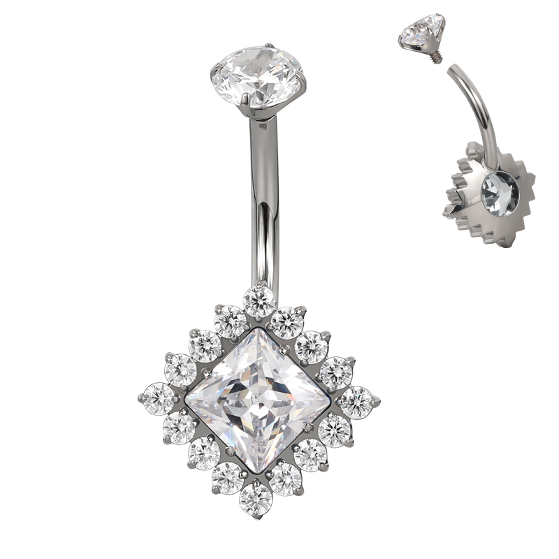 Titanium Internally Threaded Bezel Set CZ Top With Square CZ Center Flower Belly Ring