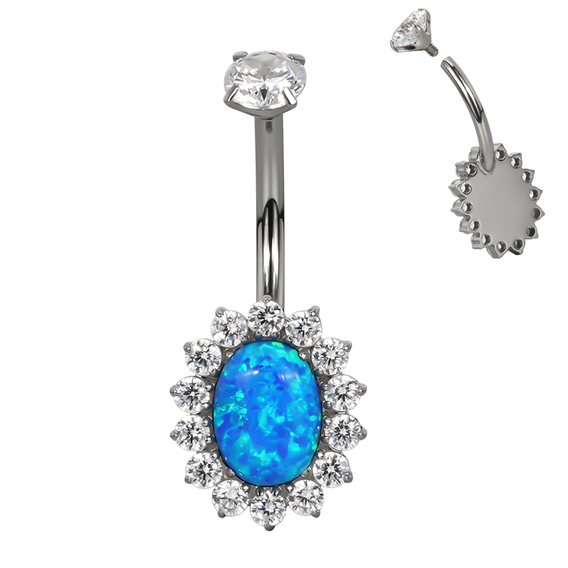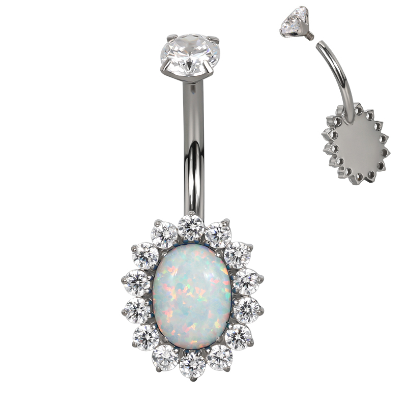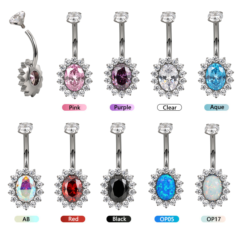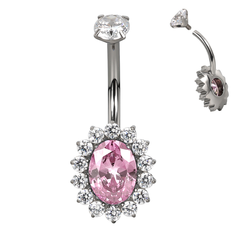 Titanium Internally Threaded Bezel Set CZ Top With Oval CZ Center Flower Belly Ring