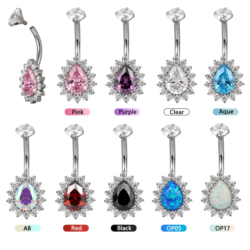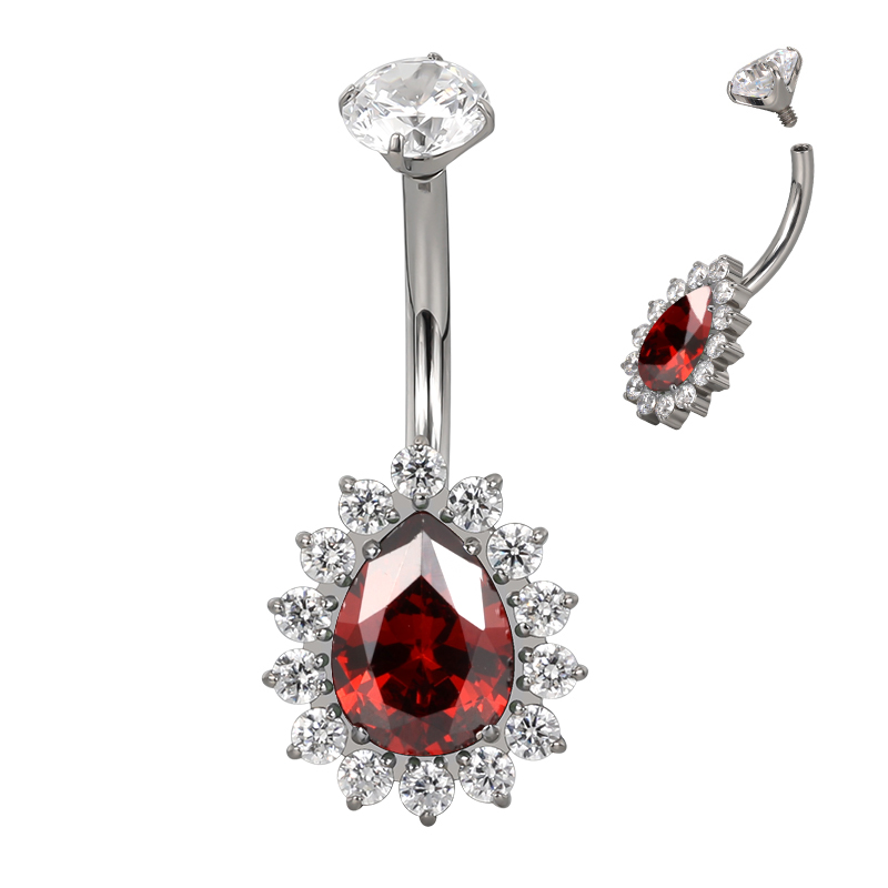 Titanium Internally Threaded Bezel Set CZ Top With Pear CZ Center Flower Belly Ring